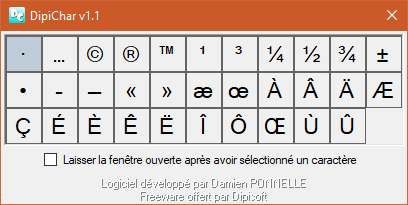 En pressant une combinaison de touches définies (par défaut CTRL+SHIFT+²), la fenêtre principale de l'outil s'ouvre et propose une liste de ces caractères généralement difficiles à saisir. Il vous suffit de cliquer sur l'un d'entre eux pour qu'il soit automatiquement inséré dans l'application dans laquelle vous étiez en train d'effectuer une saisie. La fenêtre de DipiChar disparaît alors, jusqu'à ce que vous y fassiez de nouveau appel.