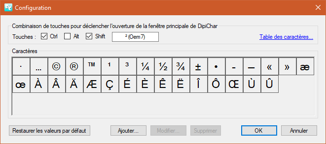 C'est aussi dans cette fenêtre de configuration que vous pouvez, si vous le souhaitez, modifier la combinaison de touches qui permet de déclencher l'ouverture de la fenêtre de DipiChar.