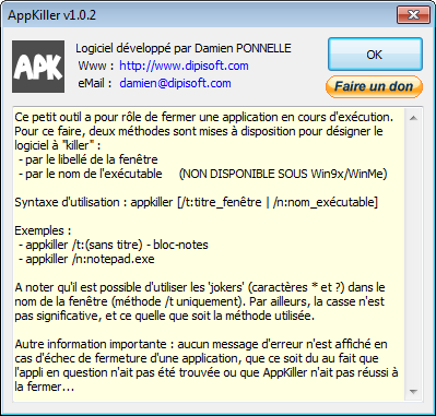 En effet, AppKiller vous permettra de tuer des processus sans passer par une interface graphique (à quoi bon refaire un gestionnaire de tâches ?!) grâce à son utilisation en mode "ligne de commande" (il est donc très simple de créer un raccourci sur le bureau pour tuer une application qui plante souvent). Grâce à une syntaxe très simple, vous pourrez tuer un processus désigné soit par le nom de sa fenêtre, soit par le nom de son exécutable.