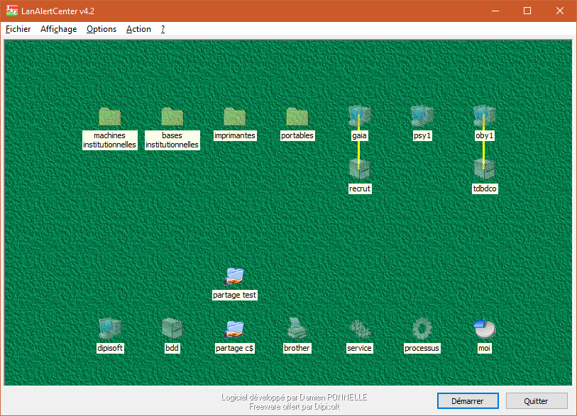 Cependant, histoire d'être critique et peut-être vous aider à le rendre plus perfectible, dommage que l'on ne puisse pas cacher "au répertoire" (ex. bouton droit sur le rép. et cacher les noms) et pas la totalité. Oui, oui, trouvant votre logiciel très intéressant, je suis aller plus loin dans mes config. et j'ai créé 3 répertoires. Un qui contient ma fameuse photo d'infra avec les diodes sans noms comme il faut, un qui "surveille" les postes de mes collègues pour savoir s'ils sont présent et un autre qui surveille mes machines sur VmWare. Mais là, problème, ça cache les noms des répertoires (le plus embêtant) ainsi que le contenu des 2 autres rép. qui ne contiennent pas de diodes mais juste l’icône PC et le nom... Je sais je chipote... Cela peut être en revanche corrigé par un fond d'écran avec les infos dessus.