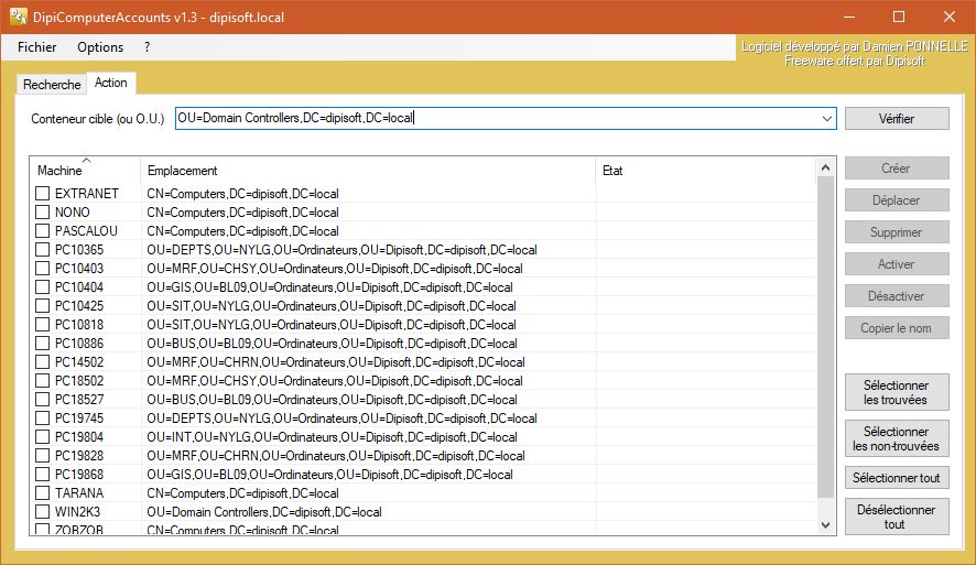 Si vous avez été attentifs, c'est écrit un peu plus haut : l'outil permet de créer, déplacer et supprimer des comptes ordinateurs. Mais il offre aussi la possibilité d'accéder à diverses informations (via une bulle d'aide qui apparaît en passant la souris sur le nom des machines) sur les machines recherchées et d'activer/désactiver des comptes. La liste des fonctionnalités est courte mais elle pourra s'enrichir en fonction des besoins éventuellement soumis par les utilisateurs.